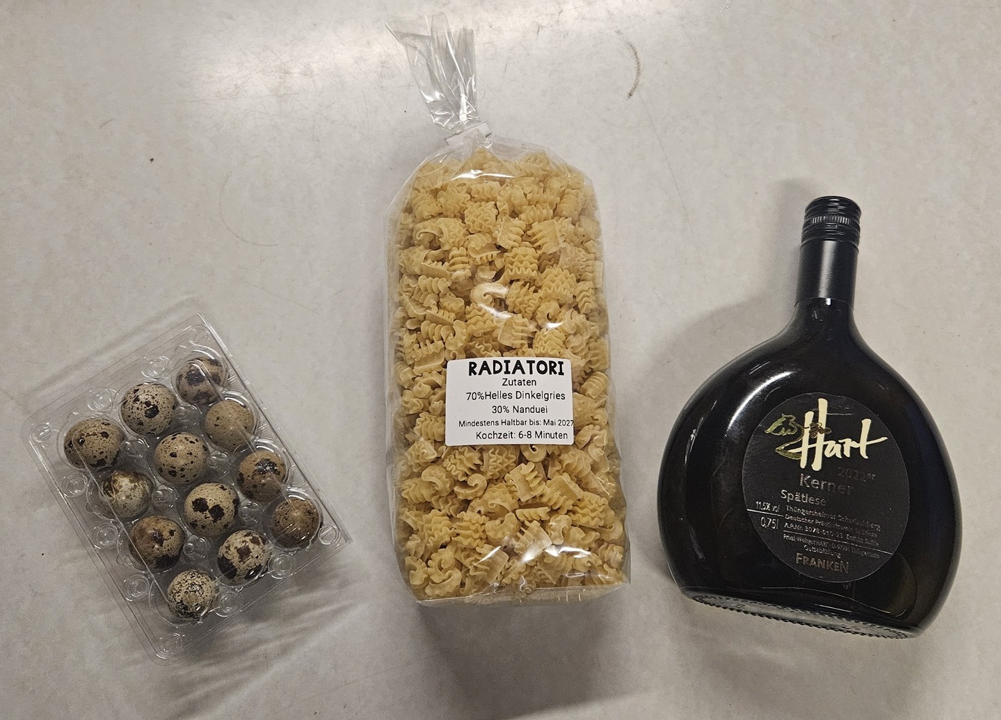 Nandu-Nudeln, fränkische Weine und Wachteleier
